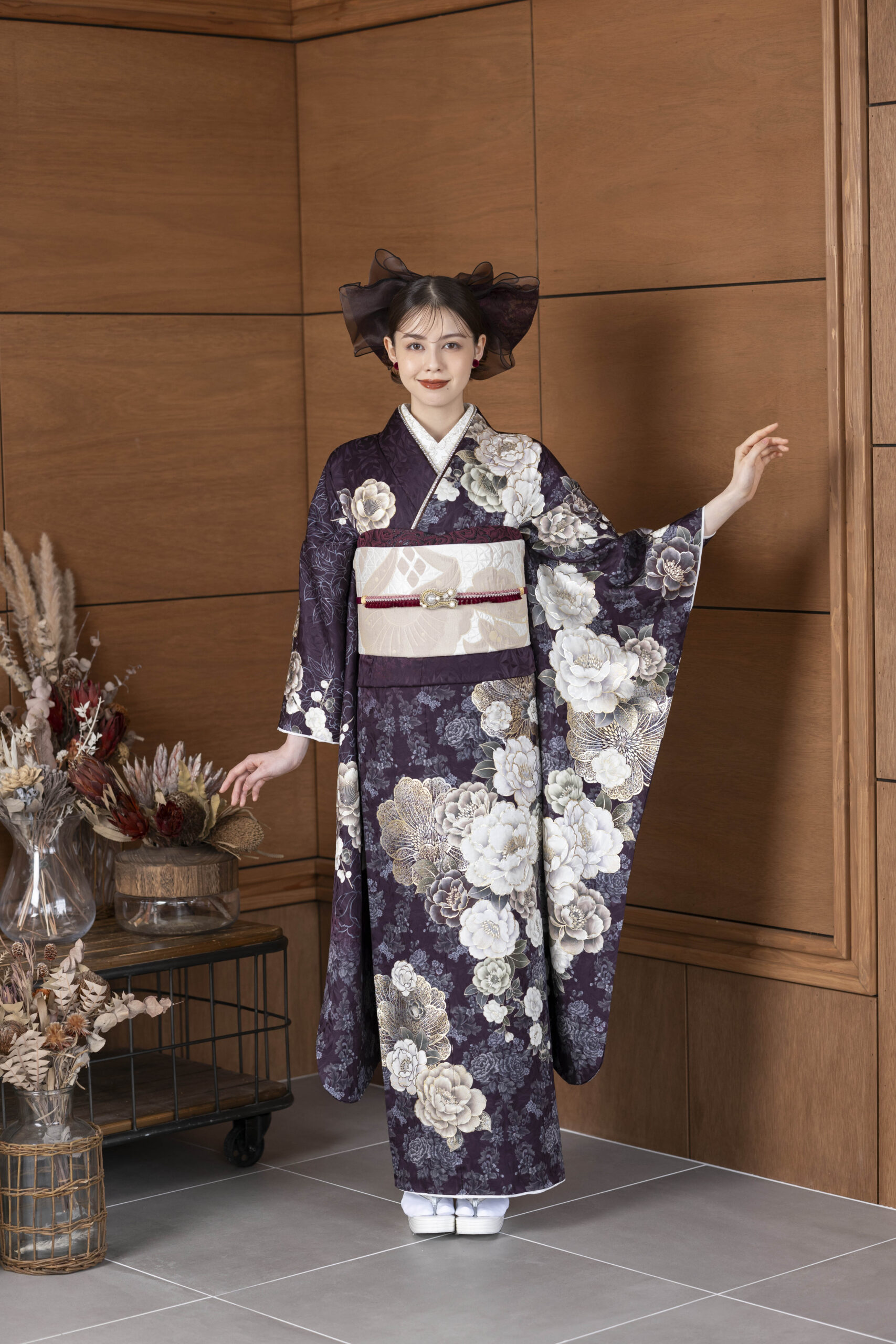 重厚感のある深い紫地に、優雅な白やベージュの牡丹が大胆に咲き誇るこちらの振袖は、大人の品格と気品を感じさせる一着です。