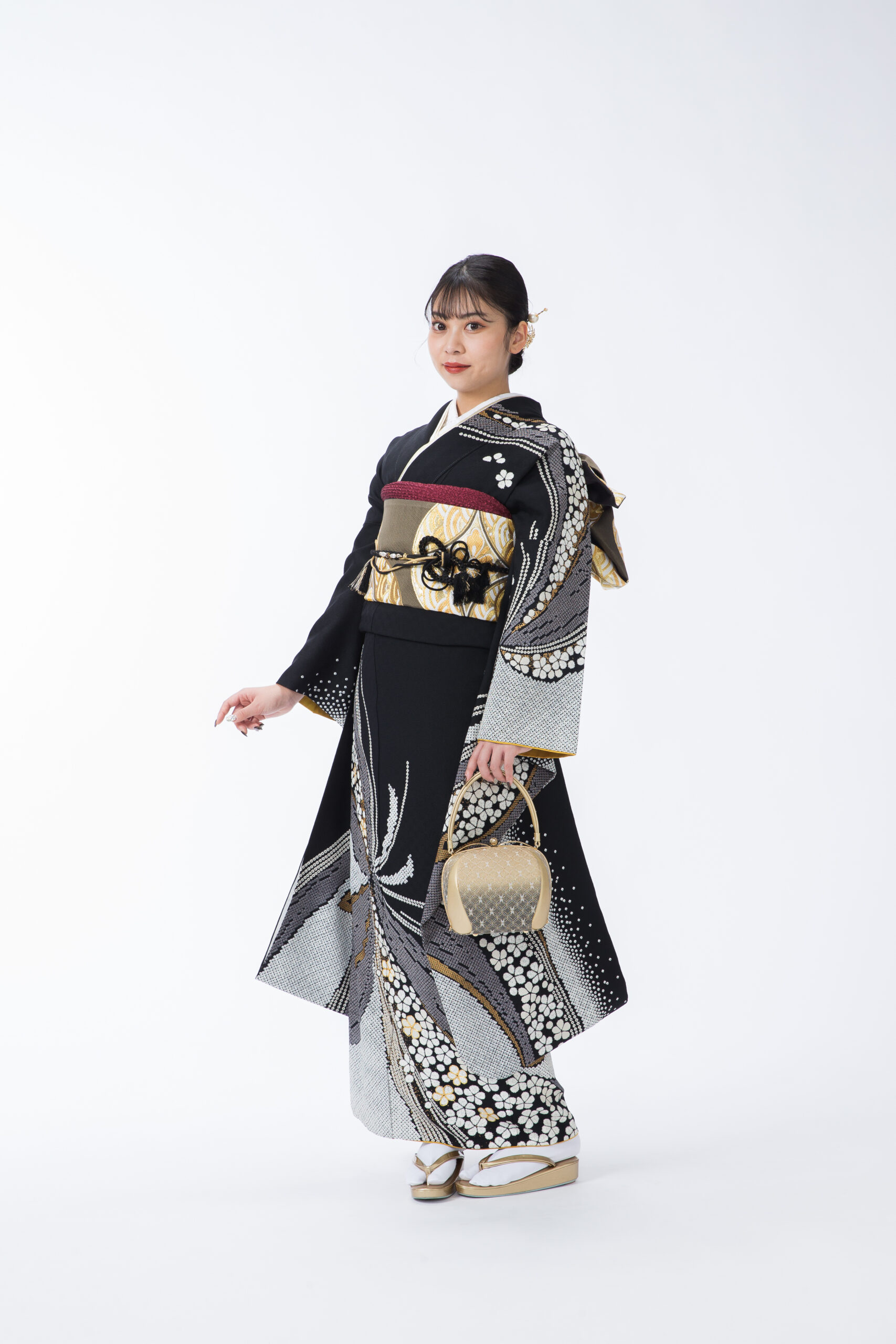 漆黒の地に流れるような模様が美しい、洗練された印象のモダン振袖。