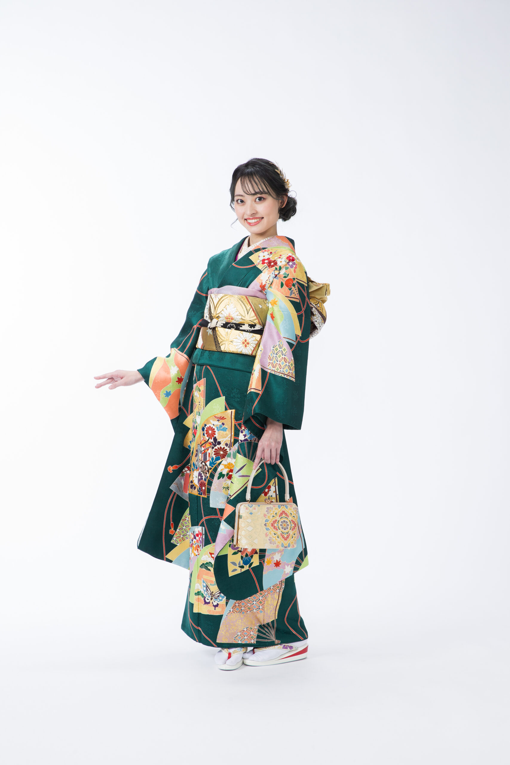 深みのあるグリーンの地色に、色鮮やかな扇面や花々が描かれた、重厚感と華やかさを併せ持つ古典柄振袖です。