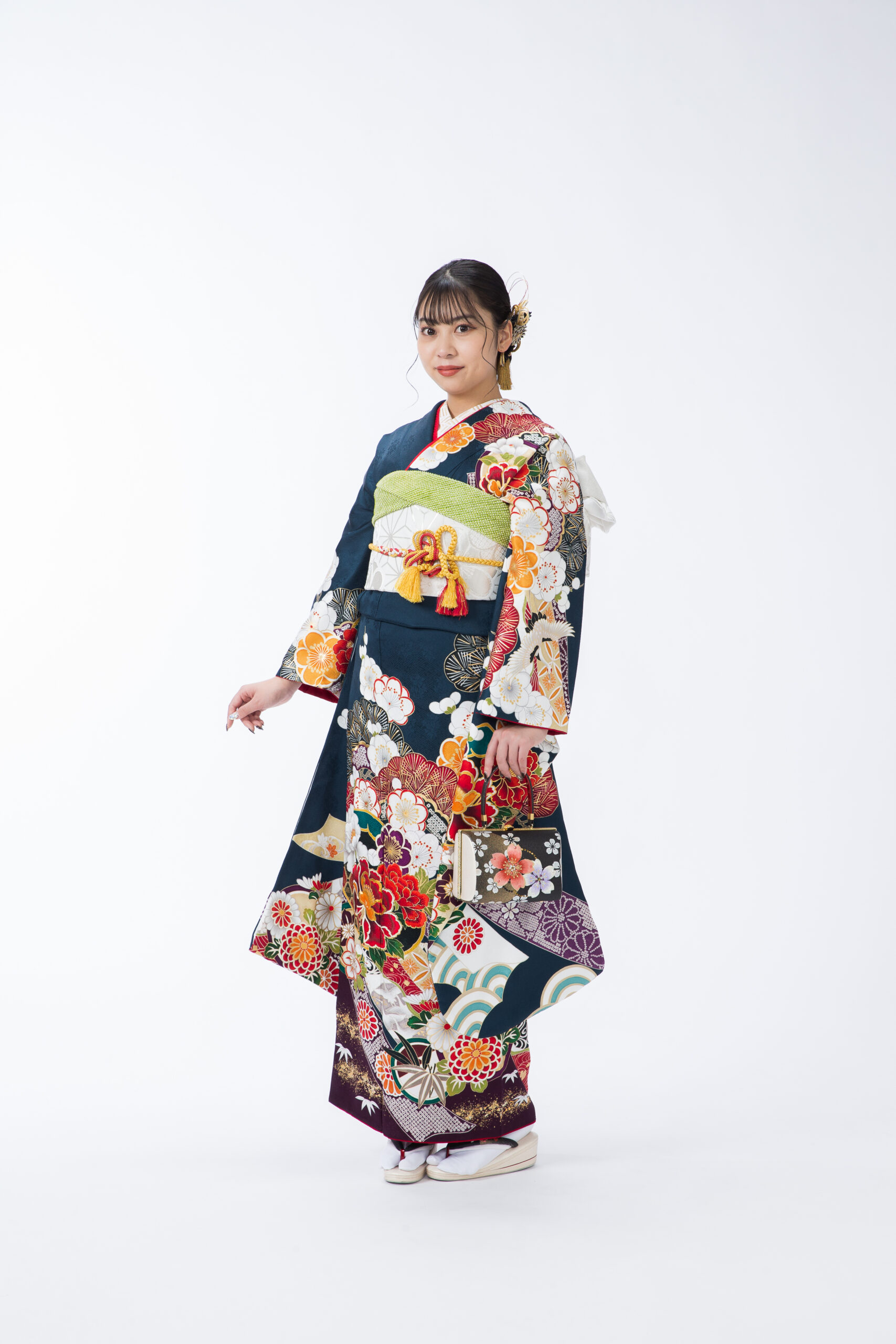 深みのある藍色地に、赤や白、金の華やかな柄が美しく映えるこちらの振袖は、格式と華やかさを兼ね備えた王道の古典スタイル。