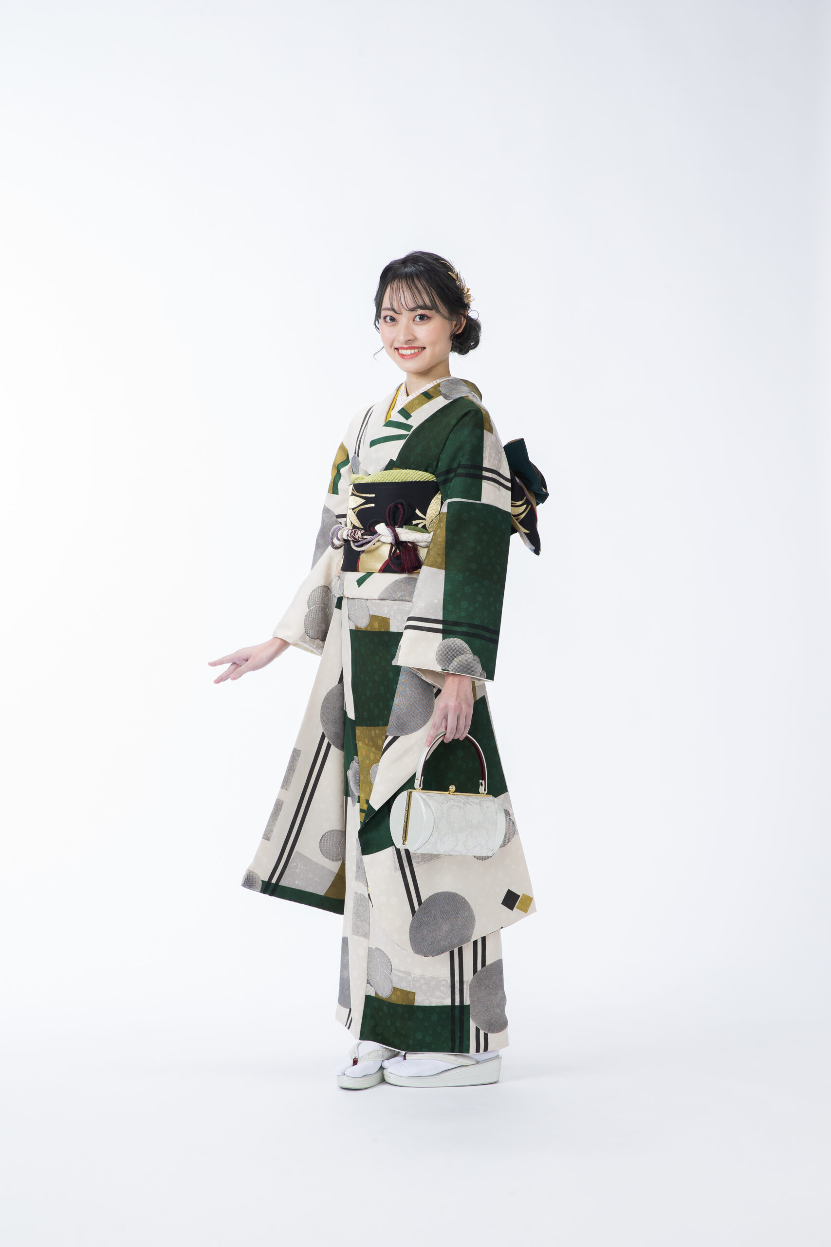 モダンで洗練された雰囲気をまとったこちらの振袖は、ベージュをベースに深みのあるグリーンやグレーを幾何学的に配置した個性あふれる一着。