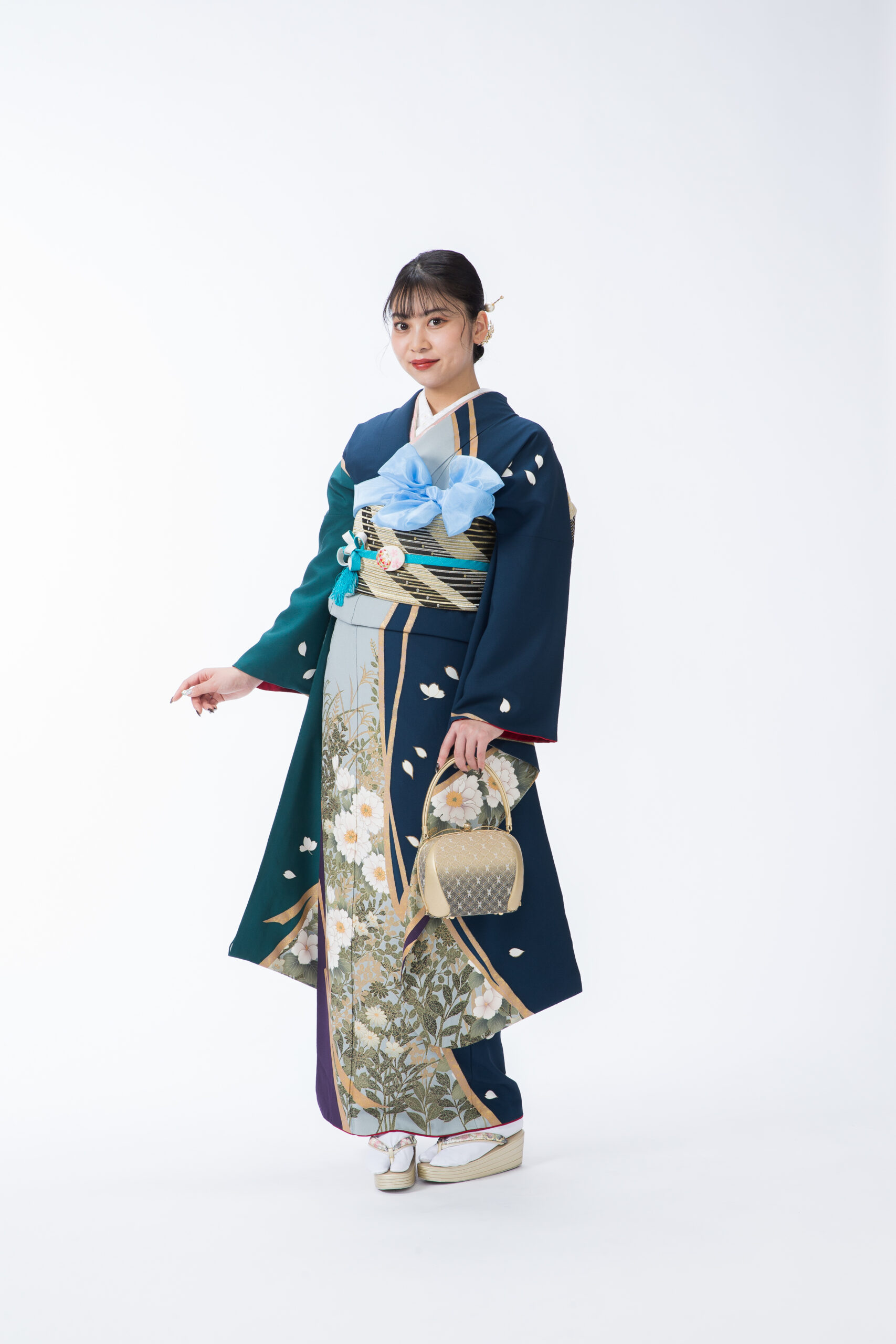 深緑と紺色の上品なグラデーションが印象的な、大人の落ち着きと華やかさを兼ね備えた振袖です。