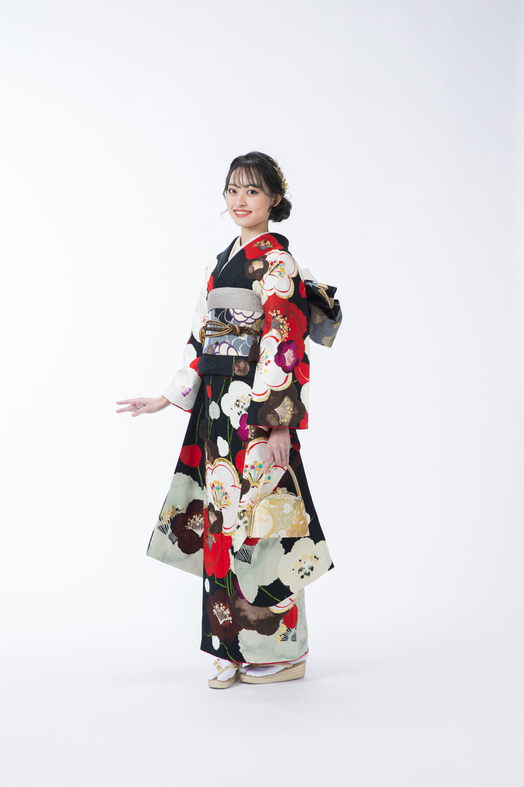 シックな黒地に大輪の梅が咲き誇る、大人の華やかさを纏ったモダン振袖。