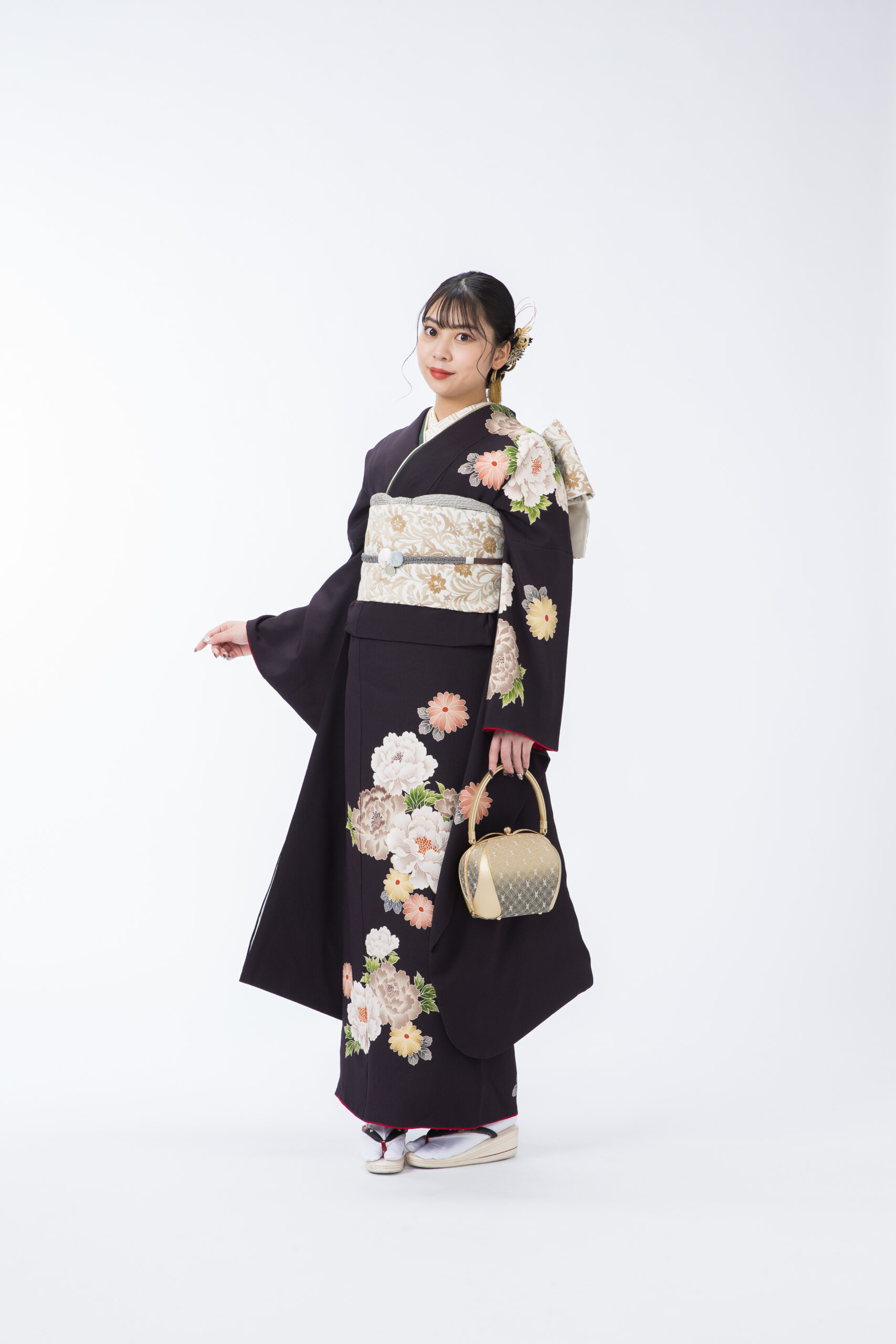 深みのあるこげ茶の地色に、やわらかな色合いの花々が咲き誇る、上品で落ち着いた雰囲気が魅力の振袖です。