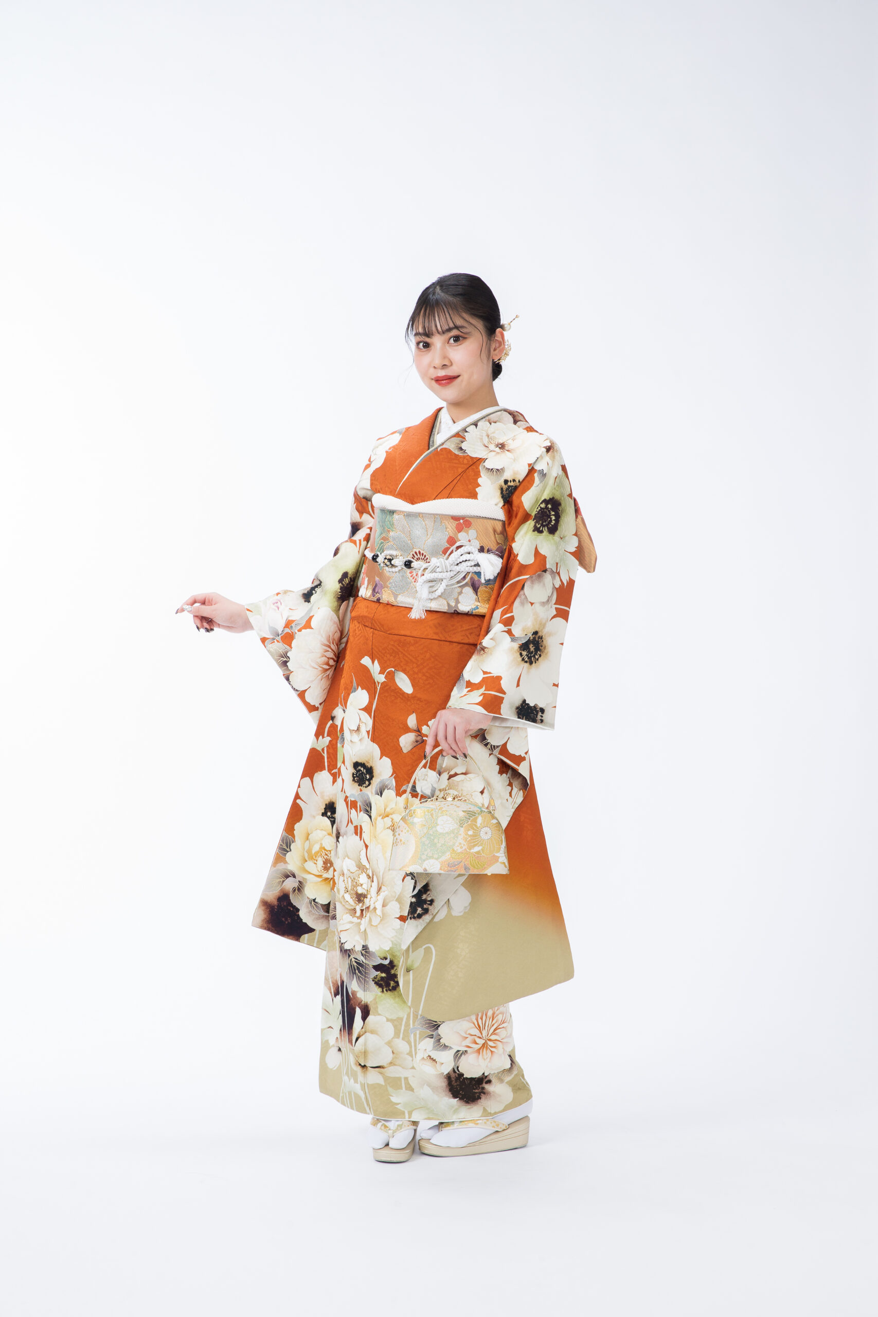 落ち着いた橙色と優しいベージュのグラデーションが美しいこちらの振袖は、クラシカルでありながら今っぽさも感じられる大人可愛い一着です。